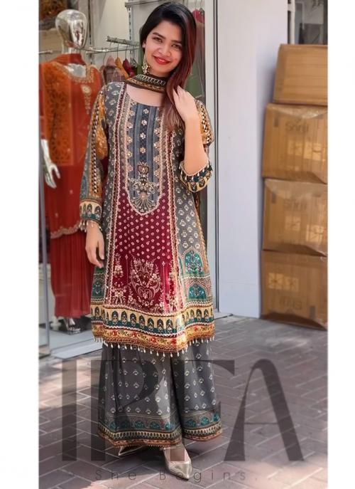 ডিজিটাল প্রিন্টের লেস ওয়ার্ক ডিজাইনের রেডিমেড থ্রি পিস